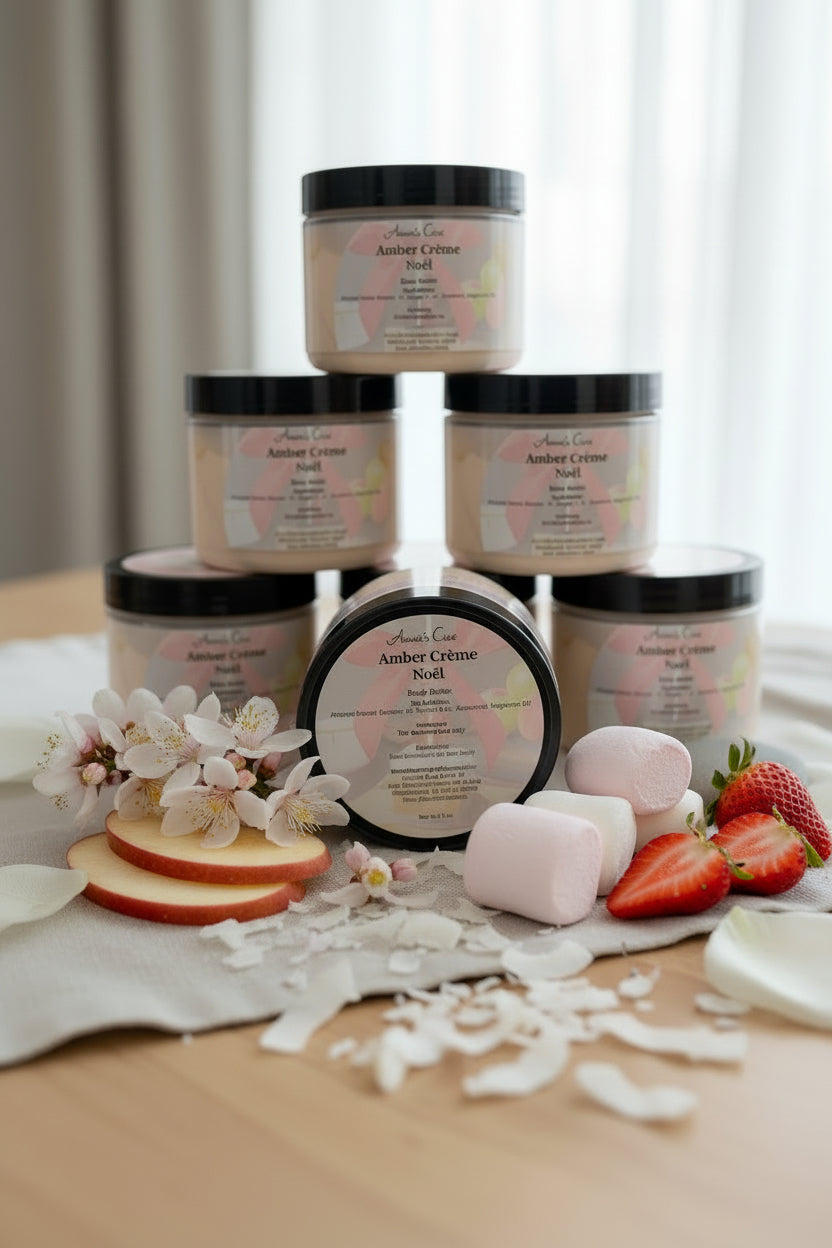 Celebrate the season with Amber Crème Noël, a warm and creamy holiday body butter crafted to envelop your skin in deep moisture and festive comfort. This rich, whipped formula melts effortlessly into the skin, delivering long-lasting hydration without feeling heavy or greasy.